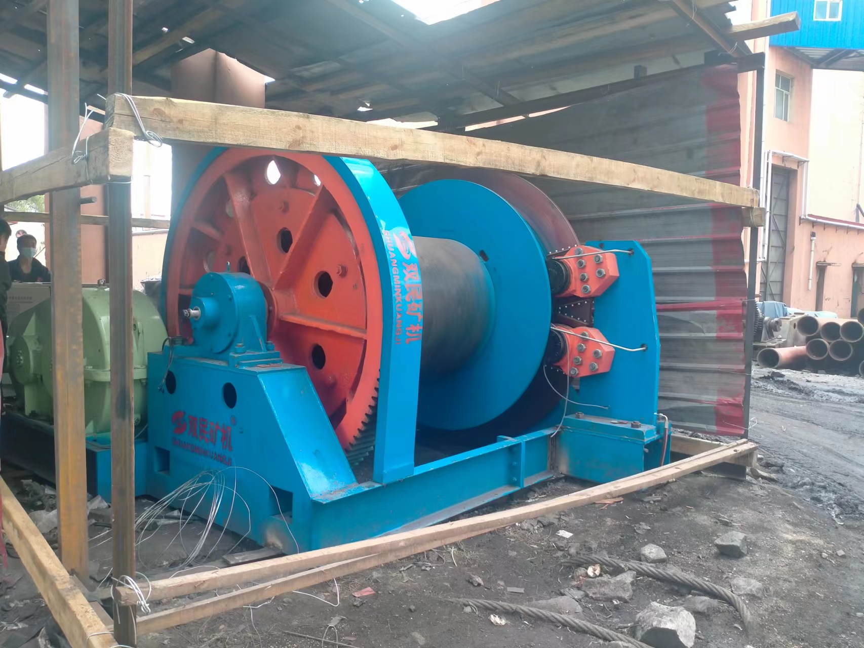 本絞車主要用于煤礦、金屬礦和非金屬礦豎井井筒掘進時懸吊吊盤、水泵、水管、注漿泵、風筒等掘進設備和張緊穩繩,該絞車系雙鋼絲繩懸吊。將減速機上的差動手把放在差動位置,若張緊穩繩,可使兩根穩繩的張緊力保持相等;若懸吊水管、注漿管、風筒等管類設備,可保證其被懸吊管類設備與地面保持垂直的狀態。如果懸吊吊盤等盤狀設備,需將其差動手把放在直通位置,才能實現兩繩繩速的一致。