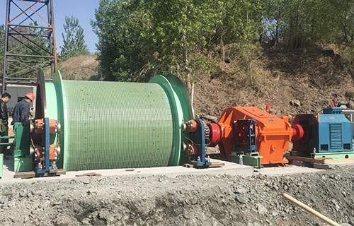 該提升機的主軸裝置有固定卷筒、活動卷筒(僅雙筒用)主軸、兩個軸承座、調繩機構(僅雙筒用)等部分組成,用來纏繞或釋放鋼絲繩。單筒提升機鋼絲繩為上出繩,雙筒提升機活動卷筒為下出繩,固定卷筒為上出繩,卷筒上裝有襯木。
