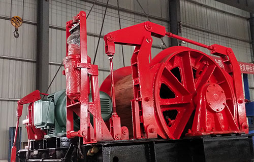 該提升絞車的主軸裝置有固定卷筒、活動卷筒(僅雙筒用)主軸、兩個軸承座、調繩機構(僅雙筒用)等部分組成,用來纏繞或釋放鋼絲繩。單筒提升絞車鋼絲繩為上出繩,雙筒提升絞車活動卷筒為下出繩,固定卷筒為上出繩,卷筒上裝有襯木。