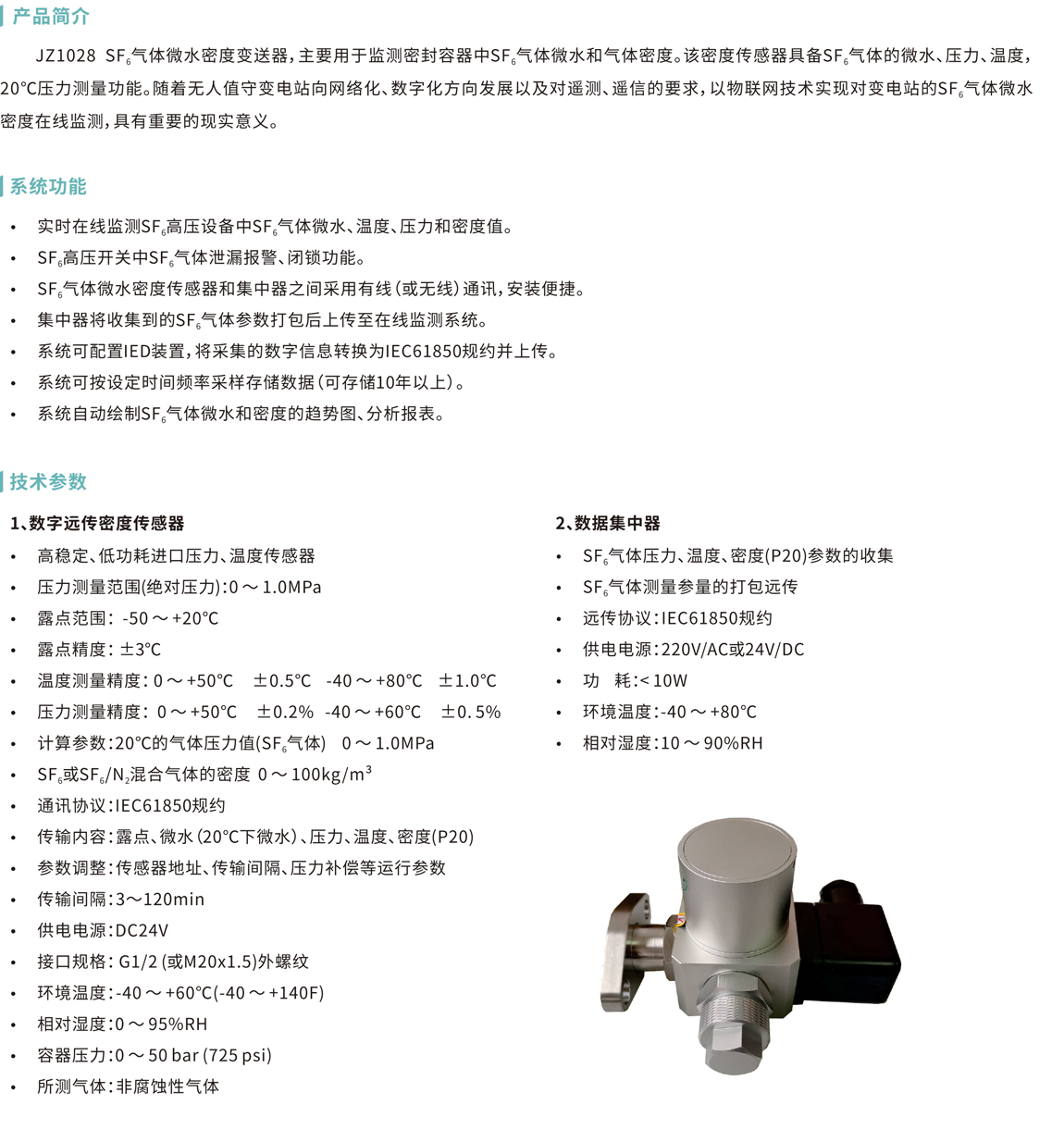 JZ1028SF6氣體微水密度變送器,主要用于監(jiān)測密封容器中SF6氣體微水和氣體密度。該密度傳感器具備SF6氣體的微水、壓力、溫度,20°℃壓力測量功能。隨著無人值守變電站向網(wǎng)絡(luò)化、數(shù)字化方向發(fā)展以及對遙測、遙信的要求,以物聯(lián)網(wǎng)技術(shù)實(shí)現(xiàn)對變電站的SF6氣體微水密度在線監(jiān)測,具有重要的現(xiàn)實(shí)意義。