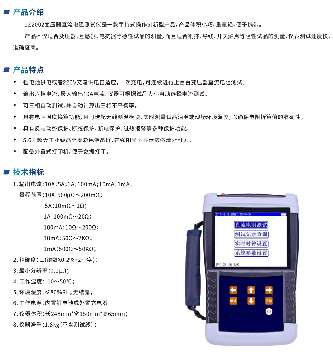 JZ2002變壓器直流電阻測試儀是一款手持式操作創新型產品,產品體積小巧,重量輕,便于攜帶。 產品不僅適合變壓器、互感器、電抗器等感性試品的測量,而且適合銅排、導線、開關觸點等阻性試品的測量,儀表測試速度快、 準確度高。